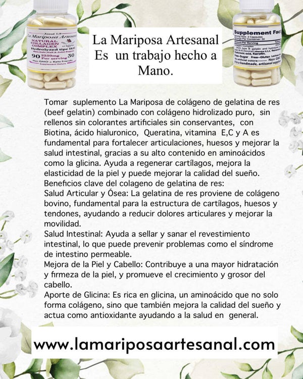 Tomar suplemento La Mariposa de colágeno de gelatina de res (beef gelatin) combinado con colágeno hidrolizado puro, sin rellenos sin colorantes artificiales sin conservantes, con Biotina, ácido hialuronico, Queratina, vitamina E,C y A es fundamental para fortalecer articulaciones, huesos y mejorar la salud intestinal, gracias a su alto contenido en aminoácidos como la glicina. Ayuda a regenerar cartílagos, mejora la elasticidad de la piel y puede mejorar la calidad del sueño.